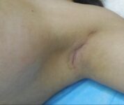 Scarless breast augmentation with 300 cc high profile implant transaxillary approach. The third set of photos shows a scarless breast augmentation (transaxillary incision at 3 months) performed by Dr. Pu.